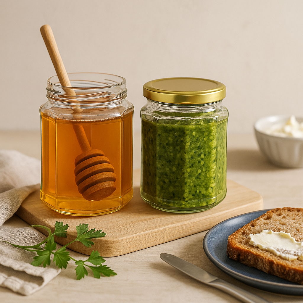 Τα κομψά πολύγωνα γυάλινα βάζα συνδυάζουν αισθητικό σχεδιασμό με πρακτική λειτουργικότητα. Η δωδεκάγωνη βάση τους τους προσδίδει μια ιδιαίτερη εμφάνιση και ταυτόχρονα εξασφαλίζει αποθήκευση που εξοικονομεί χώρο. Κατασκευασμένα στην Ευρώπη, εντυπωσιάζουν με την υψηλή ποιότητα κατασκευής και την πολυχρηστικότητά τους. Είτε για αρωματικές πάστες, πικάντικα πέστο, φρουτώδεις μαρμελάδες ή εκλεκτό μέλι – αυτά τα βάζα προσφέρουν την τέλεια συσκευασία για διάφορες εξειδικευμένες λιχουδιές.